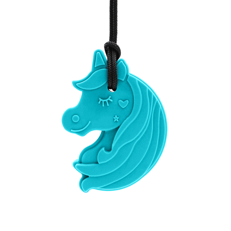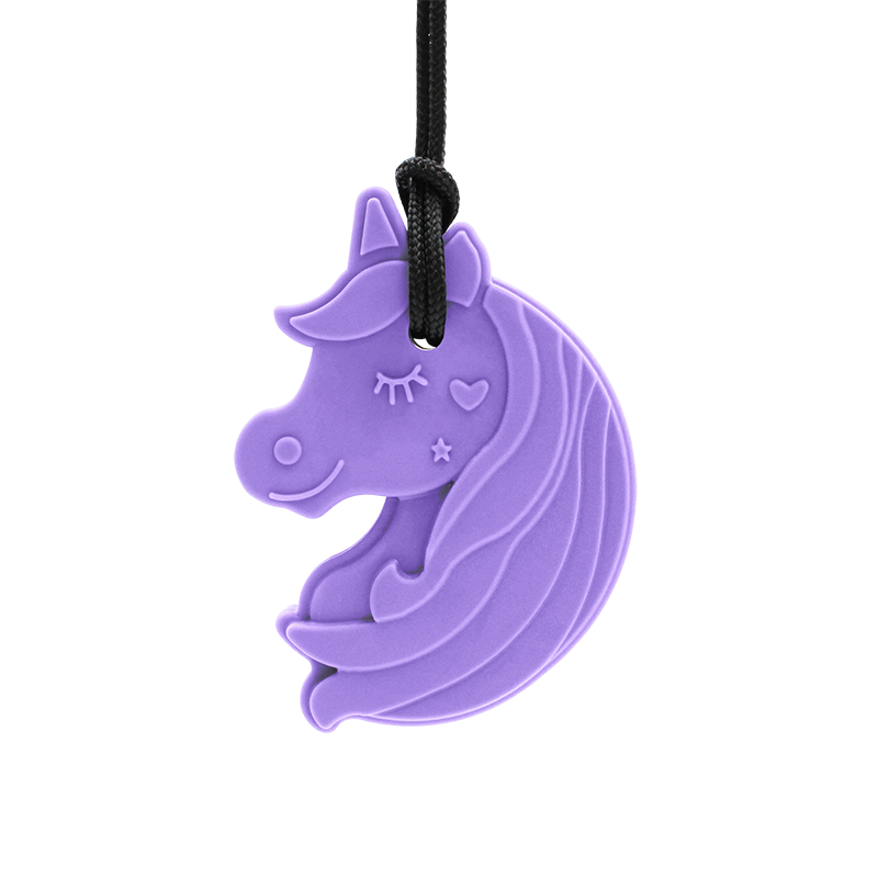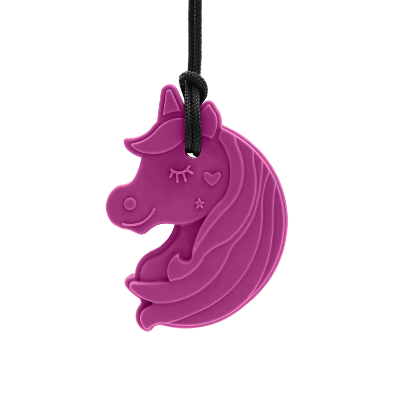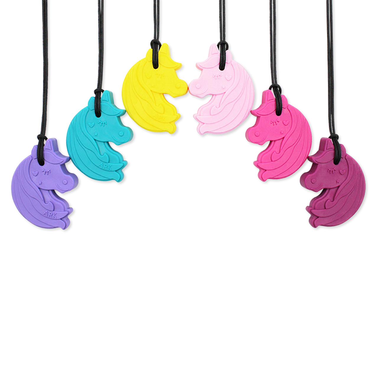 Straight out of fairy tales - a chewable unicorn necklace! ARK's Chewnicorn has a beautiful double-sided unicorn design, complete with a sweet heart and star on the face, flowing hair, and the quintessential unicorn horn. According to mythology, unicorns are said to have magical healing properties. In a similar way, many people find chewing to be effective way to calm, self-regulate, and manage stress and anxiety. Use the Chewnicorn chewable necklace as a safe alternative to chewing on shirt sleeves, collars, pencils, fingers, nails, etc. to help calm, focus, and self-regulate.