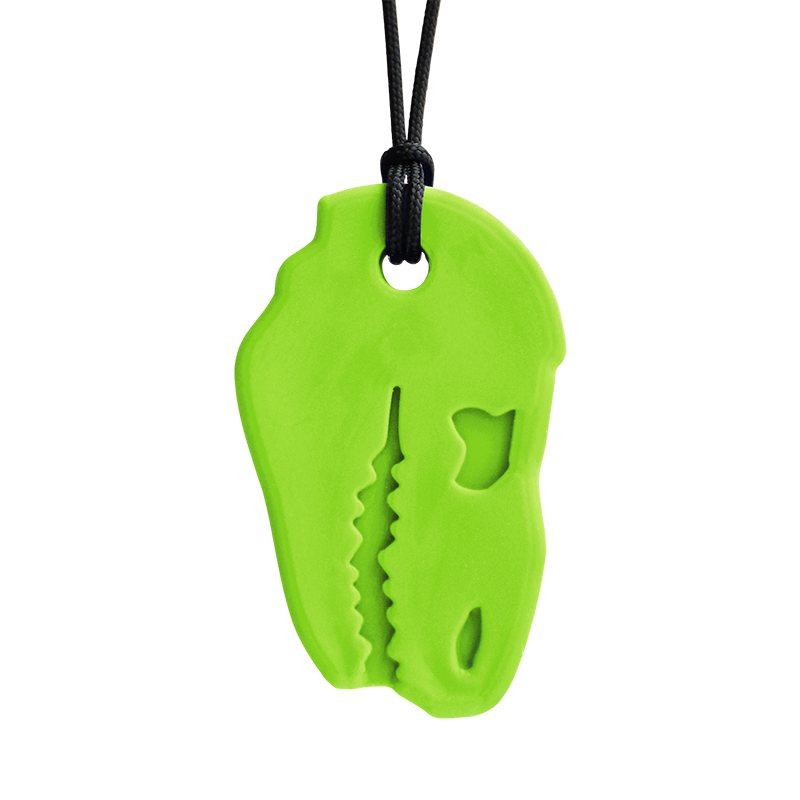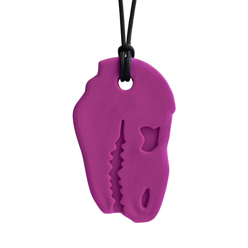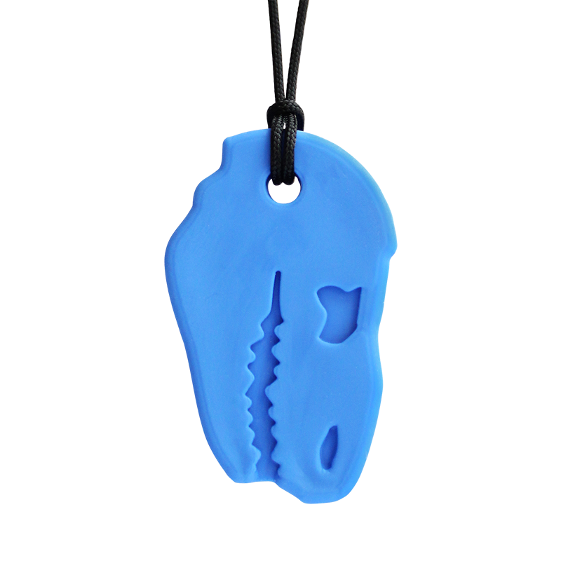 This "roarsome" T-Rex pendant design is sure to be a hit with dinosaur fans of any age. At approximately 1.5 x 2.5 inches and just under half an inch thick, this is a pretty 'beefy' chew pendant with a lot of 'meat' on its bones. It's a great option for those who prefer chewing with their pre-molars and/or front teeth. Use this oral sensory solution as a safe alternative to chewing on pencils, shirts, fingers, etc. and to help calm, focus, and self-regulate.