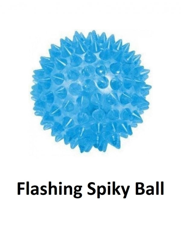 Bounce the squishy ball to activate the colored flashing lights. The soft spikes create a fun texture for fingers to explore. Perfect for those needing visual stimulation and motor skills with a fun catch and throw game. Various colors.