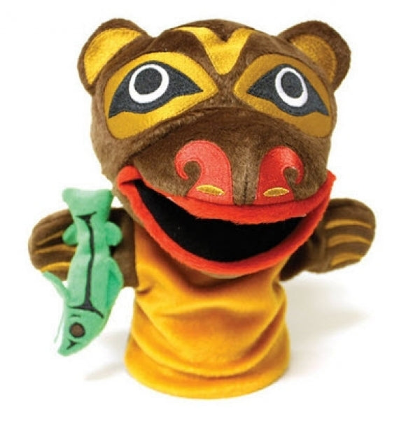 Hunter the Bear is a high quality hand puppet approximately 10" - 14". Made of all new materials. Art by Corey Bulpitt, Haida.