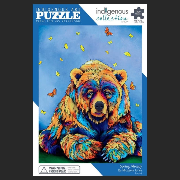 This beautiful multicoloured Indigenous Bear puzzle will bring hours of fun. Its finished size is 26.7 x 19.3 inches (cm below). The artwork is meticulous; it is authentic indigenous art and the artist is paid a royalty on each sale. To know more about the artist, you can read her biography on the back of the puzzle box. The artist, Micqaela Jones is Te-moak.