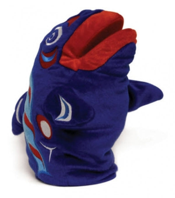 Streamer the Salmon is a high quality hand puppet approximately 10" - 14". Made of all new materials. Art by Eric Parnell, Haida.