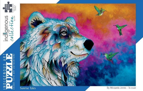 1000 piece puzzle. Finished size 24 x 18 inches. Authentic indigenous art and the artist is paid a royalty on each sale. Artist biography on back. Micqaela Jones is Te-moak.