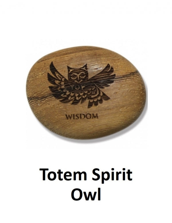 This totem spirit is made from reclaimed wood and is laser etched with an inspiring word. Use for inspiration and blessing. Each totem spirit is unique in color and grain. Totem spirit Owl comes on dark wood. Art by Simone Dlamond, Coast Salish.