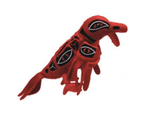 Trickster the Raven is a high quality plush toy approximately 6". Made of all new material. Art by Beau Dick, Kwakwaka'wakw.