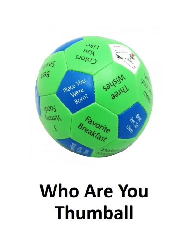 Green/Blue 32 panel Thumball(4″). Fun innovative way for children to get acquainted. Stimulates social conversation and develops inter-personal communication skills. Showing interest in others by asking questions and actively listening to responses lays a foundation for friendships and improved relationships. On each panel you will find a word or photo relating to a specific subject. Toss the ball and answer for yourself or ask another player the question. Promotes social skills and development.