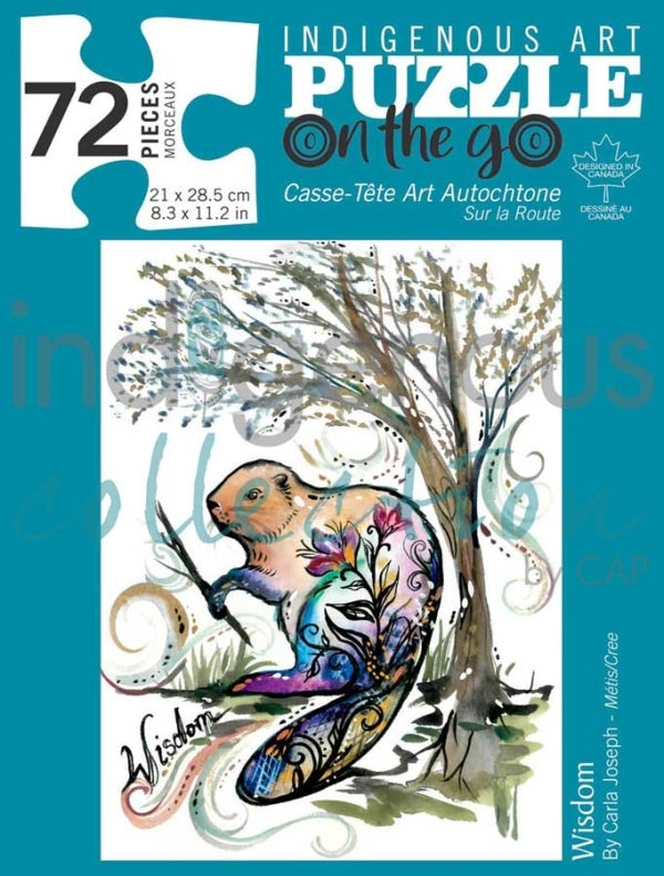 Wisdom 72 piece puzzle, by artist Carla Joseph. Her cultural background is Metis/Cree. The artist is paid a royalty on every sale. 72 piece puzzle, package in a tin box. Finished size is 8.3" x 11.2" (21cm x 28.5cm). For ages 3 and up.